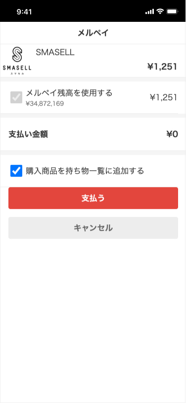 メルペイのお支払い画面で「購入商品を持ち物一覧に追加する」にチェックを入れて購入します