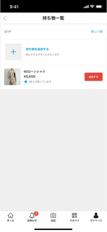 メルペイ決済でご注文した商品がメルカリの持ち物一覧に追加されます。