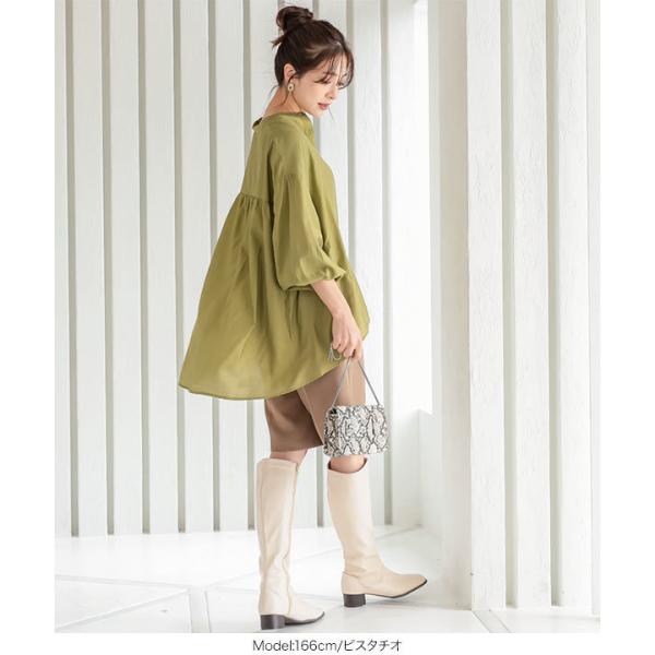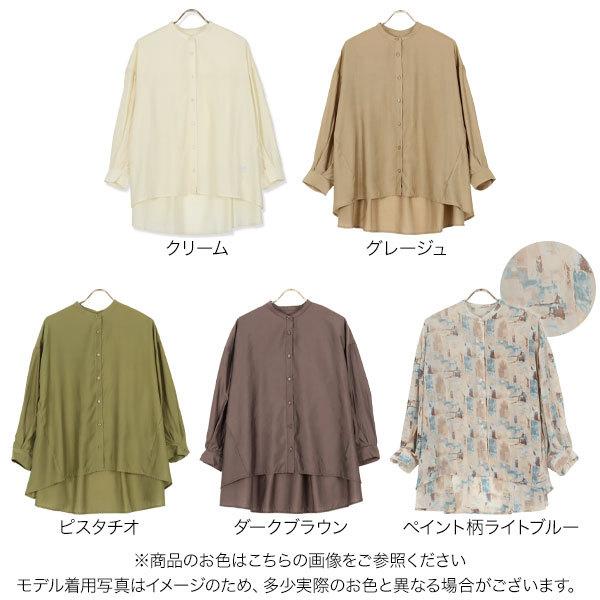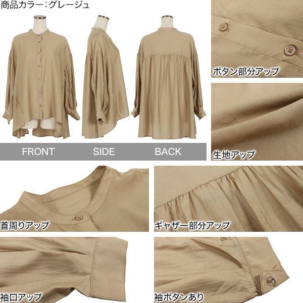 上品 バンドカラーバックフレアシャツ レディース トップス 羽織り 長袖 チュニック丈 ギャザー 体型カバー C5623