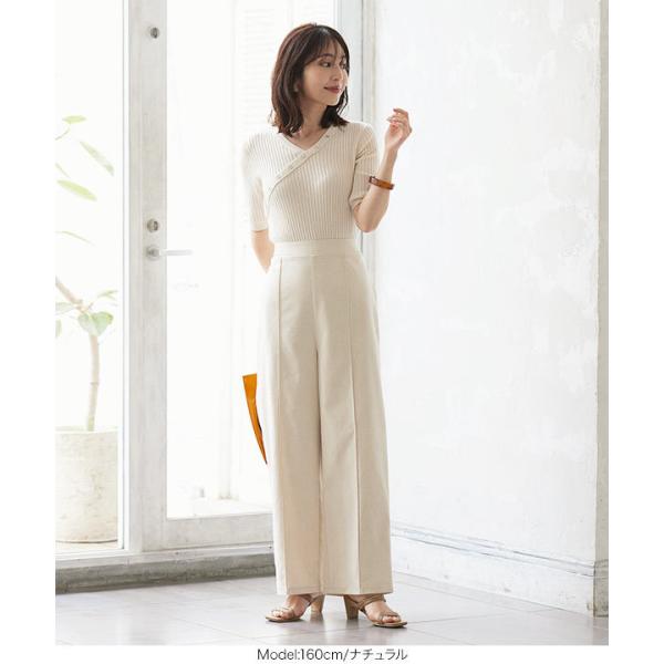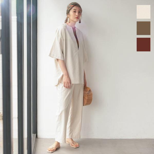 ゆったり リネン混生地バックウエストゴム裏地付きワイドパンツ レディース 麻 夏 涼しい セットアップ M3294
