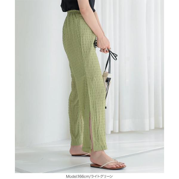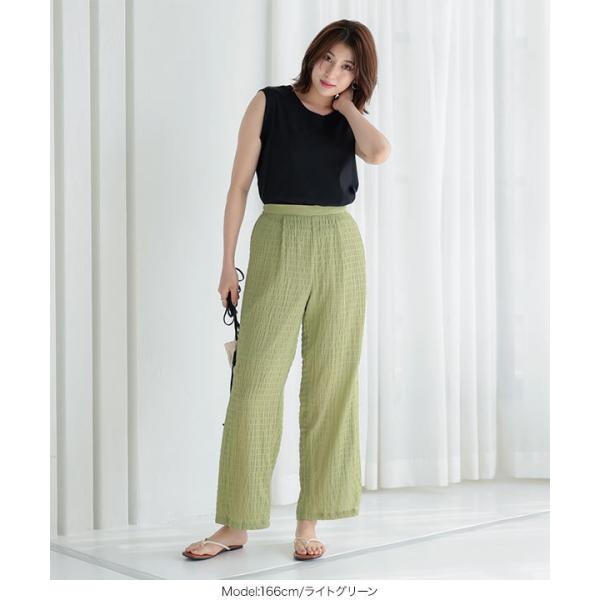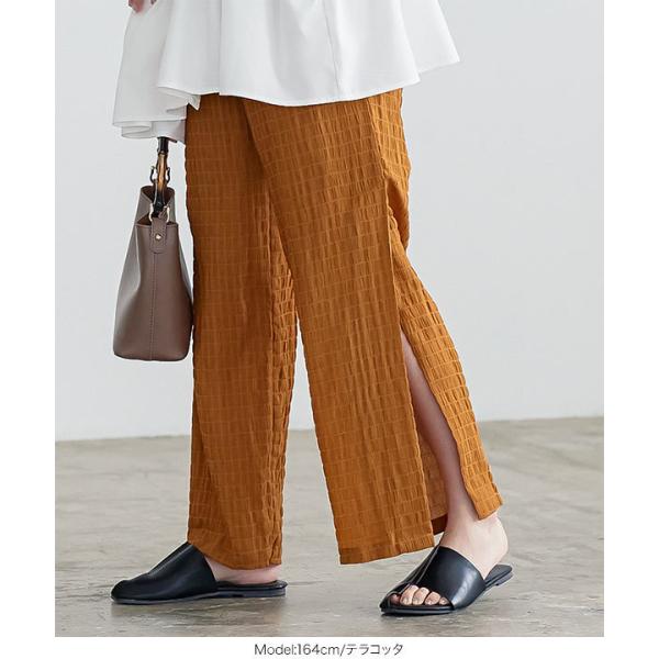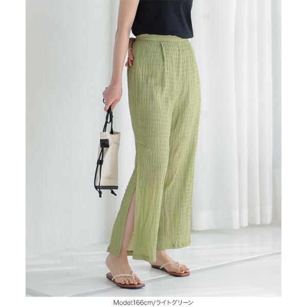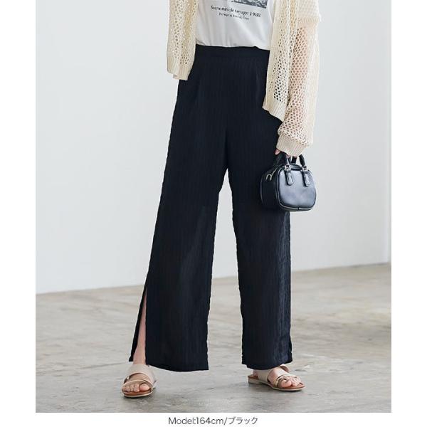 ワイドパンツ シアー 透け感 柄 サイドスリット レディース ボトムス スリット ゆったり パンツ チェッ...