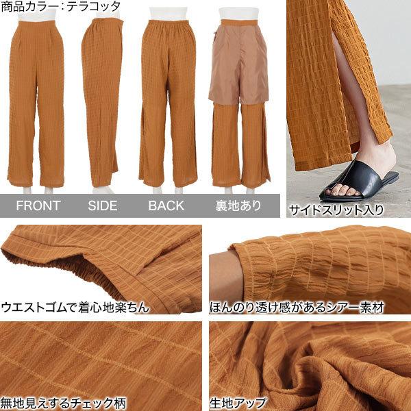 ワイドパンツ シアー 透け感 柄 サイドスリット レディース ボトムス スリット ゆったり パンツ チェック M3597