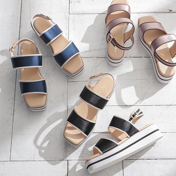 目を引くサテン素材とパイピングの配色がかわいいスクエアトゥの2ベルトサンダル。