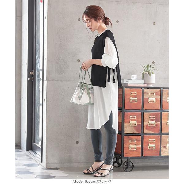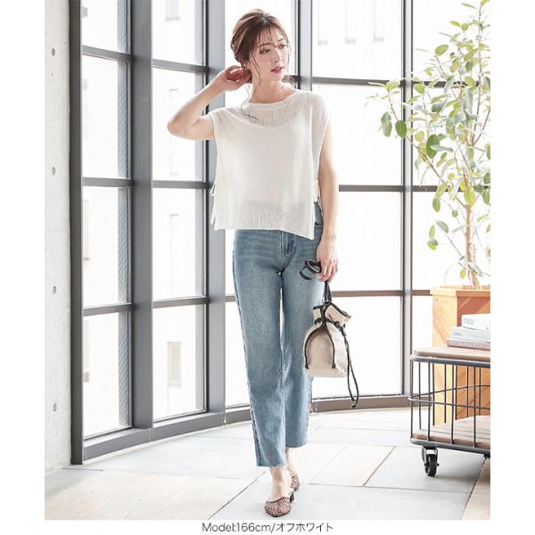 トップス サマーニット ノースリーブ サイドリボン 透け ゆったり 大人 カジュアル 白 黒 レディース C4786