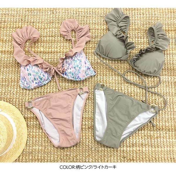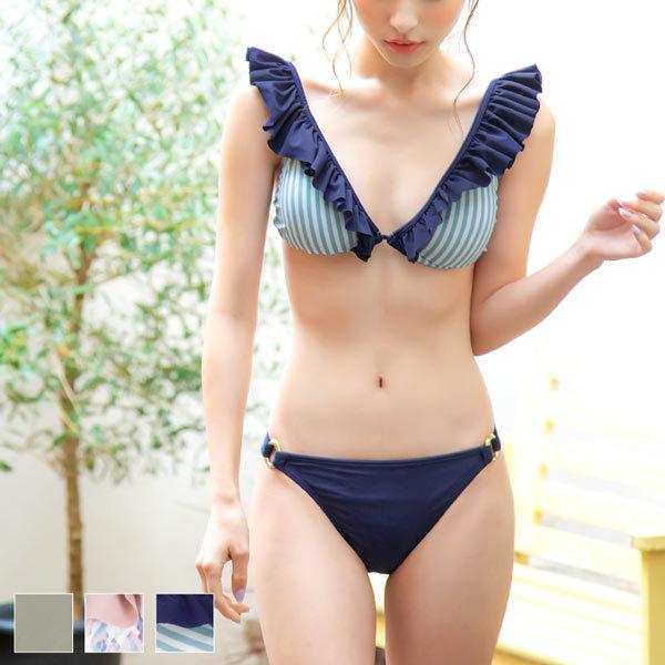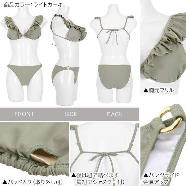 大胆に開いた胸元にフリルカラーが印象的なフリルビキニ。