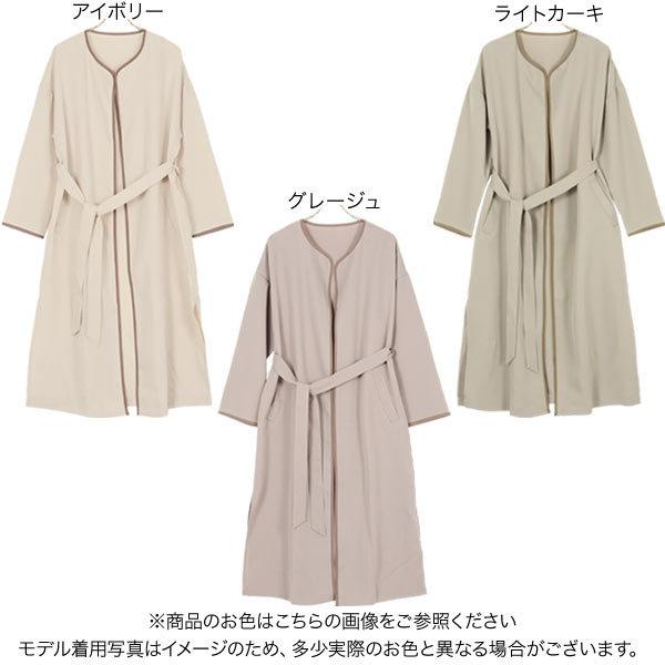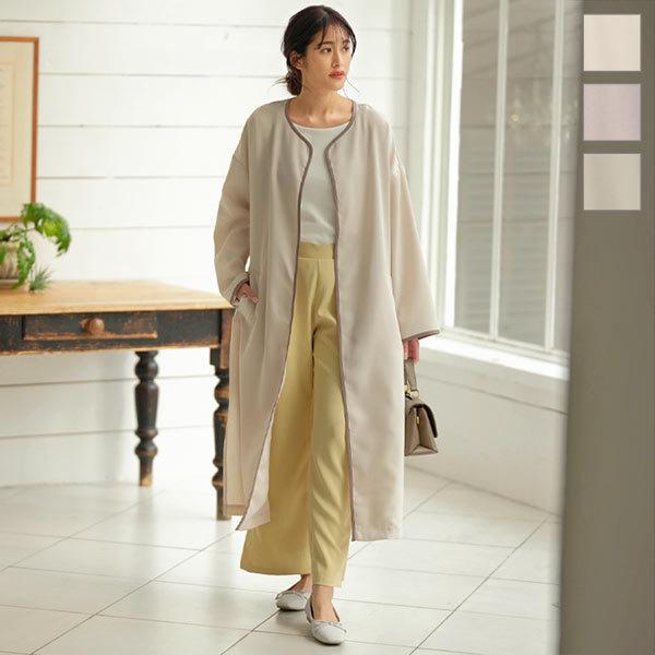 白 ベルト付き配色パイピングノーカラーサイドスリットコート レディース アウター 羽織り 長袖 ロング 上品 K994