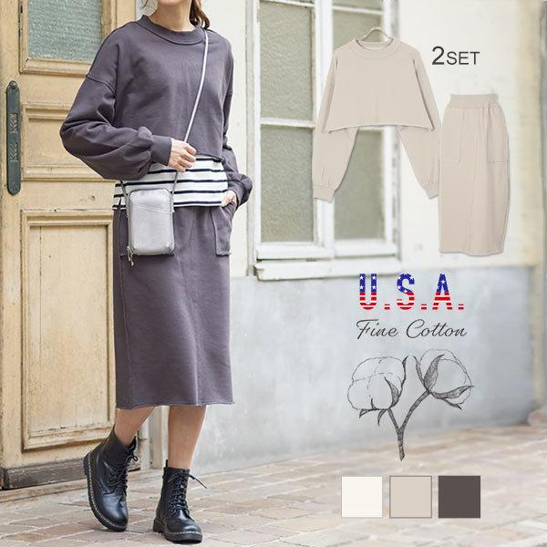 スウェット トップス スカート セットアップ USAコットン レディース 楽ちん タイトスカート E2713