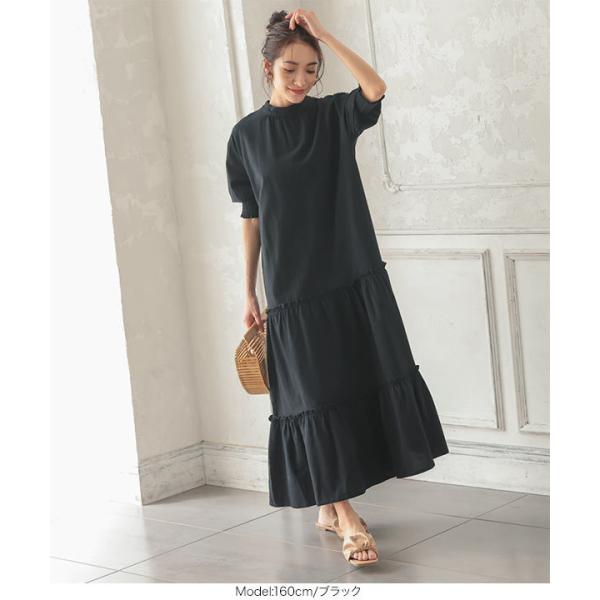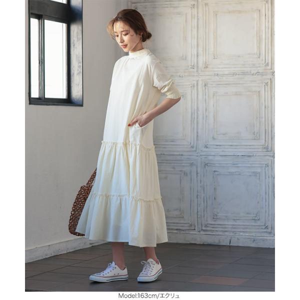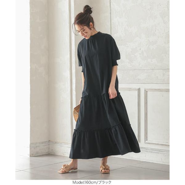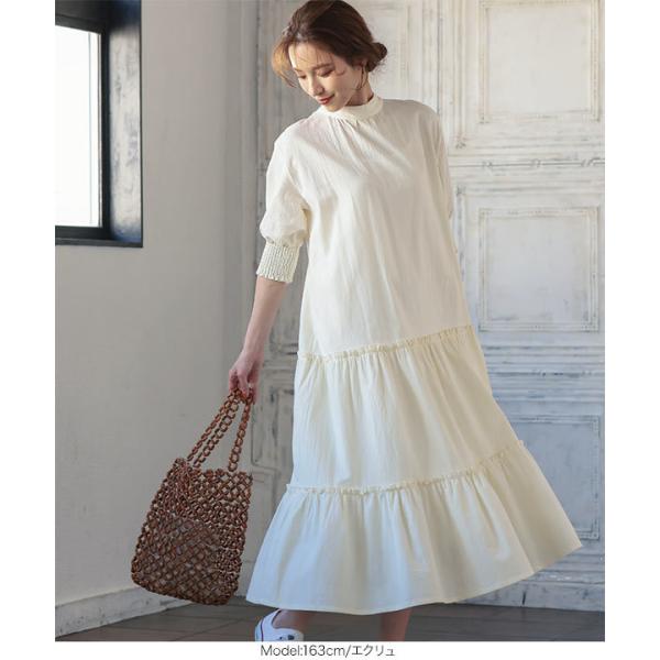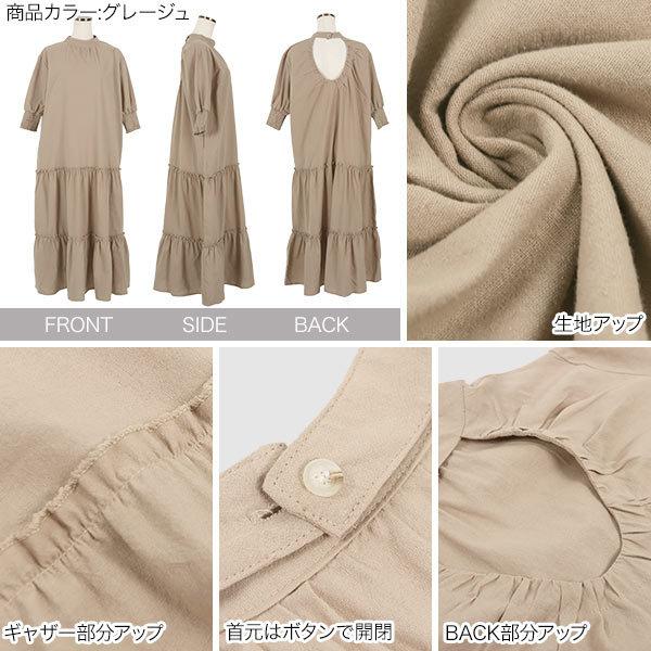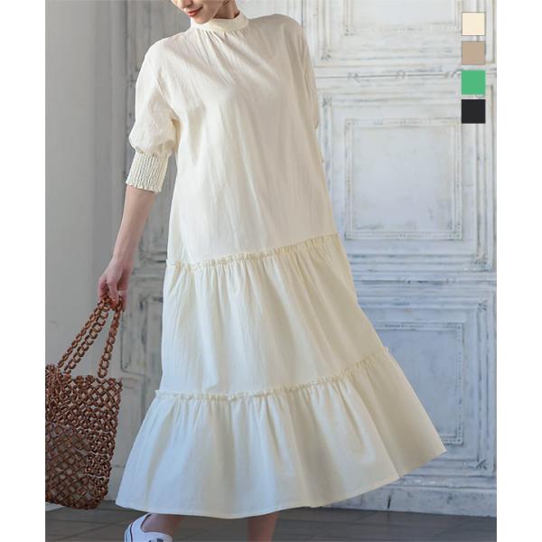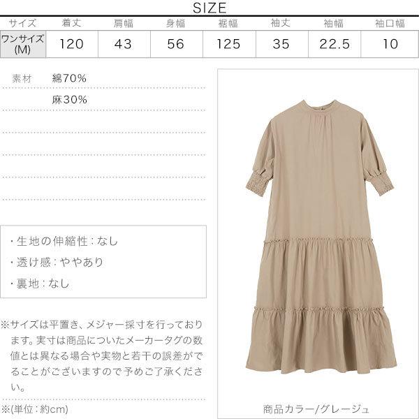 夏 バックオープンティアードワンピース レディース ロング丈 ハイネック ボリューム袖 大人 麻混 春 E2799
