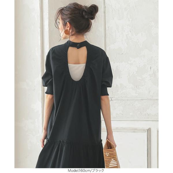 ワンピース レディース 夏 バックオープン ティアード ロング ハイネック ボリューム袖 麻混 E2799
