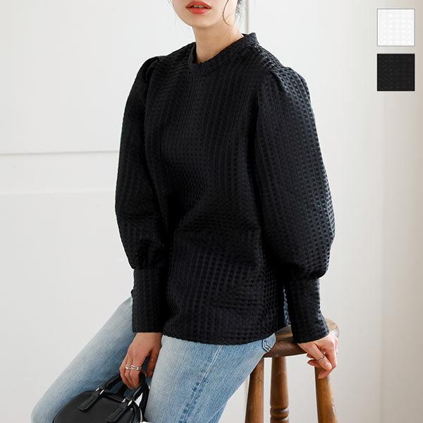 ドットジャガードボリュームスリーブブラウスプルオーバートップス
