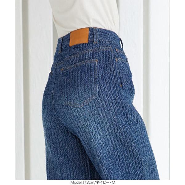 表面に凹凸のある素材感が新鮮なデニムワイドパンツ。