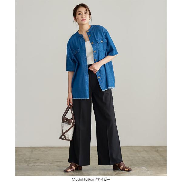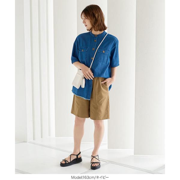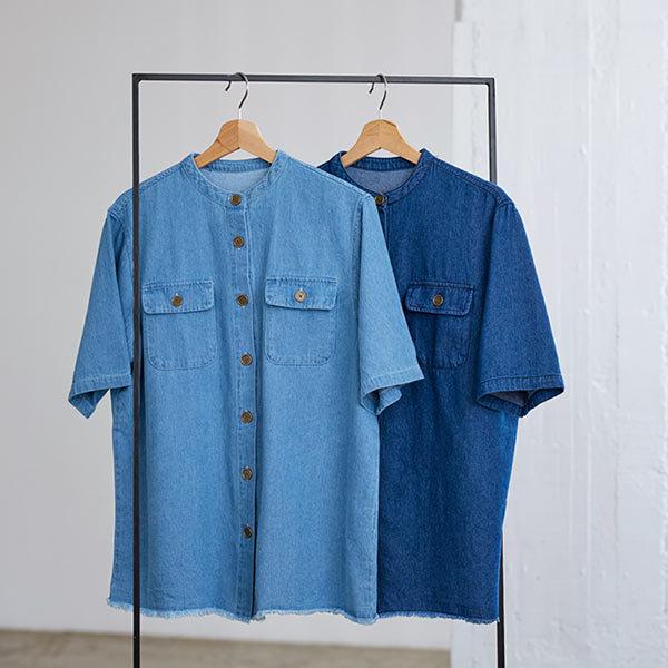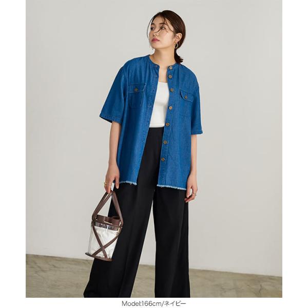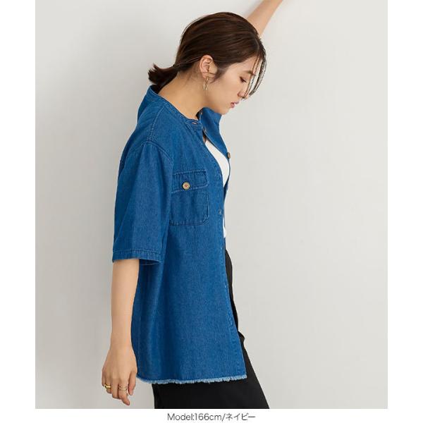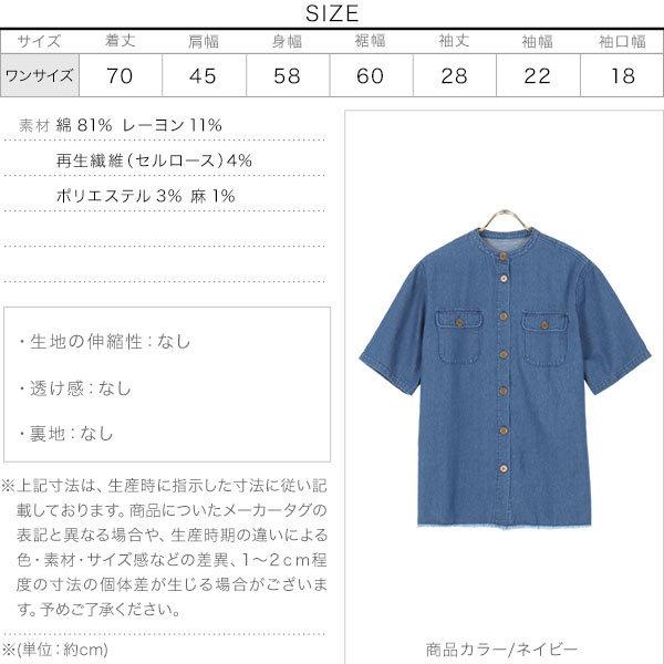 デニム シャツ レディース トップス 夏 5分袖 バンドカラー
