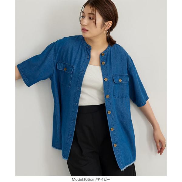 セール デニム シャツ レディース トップス 夏 5分袖 バンドカラー 裾フリンジ 羽織り カジュアル 着回...