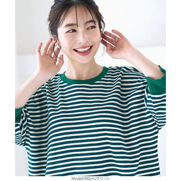 ワンピース チュニック レディース 半袖 ぽわん袖 ゆったり ボーダー柄 膝丈 サーマル 大人フェミニン ラフ E3027