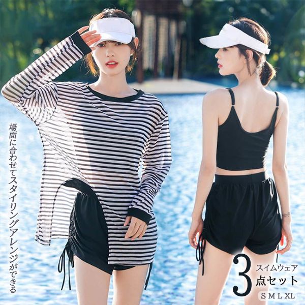 ■コメント・カジュアルスタイルを楽しめるデザインの水着3点セット。・露出が少なく日焼け対策もバッチリです。・弾力性、伸縮性抜群でノンストレスな肌心地。・通気性に優れ、軽量でやわらかく動きやすい。・スポーツジム、海、プール、サーフィン、競泳など色んな場面で活躍できます。・場面に合わせてスタイリングアレンジができます。■サイズ参照S 70A~75ABC 参考体重 -42.5kgM 75ABC~80ABC 参考体重42.5-47.5kgL 80ABC~85ABC 参考体重47.5-52.5kgXL 80ABC~90AB 参考体重52.5-62.5kg※平置き採寸の為、2~3cm誤差が生じる場合がございます。ご了承くださいませ。