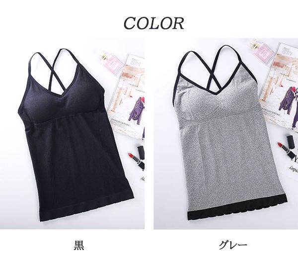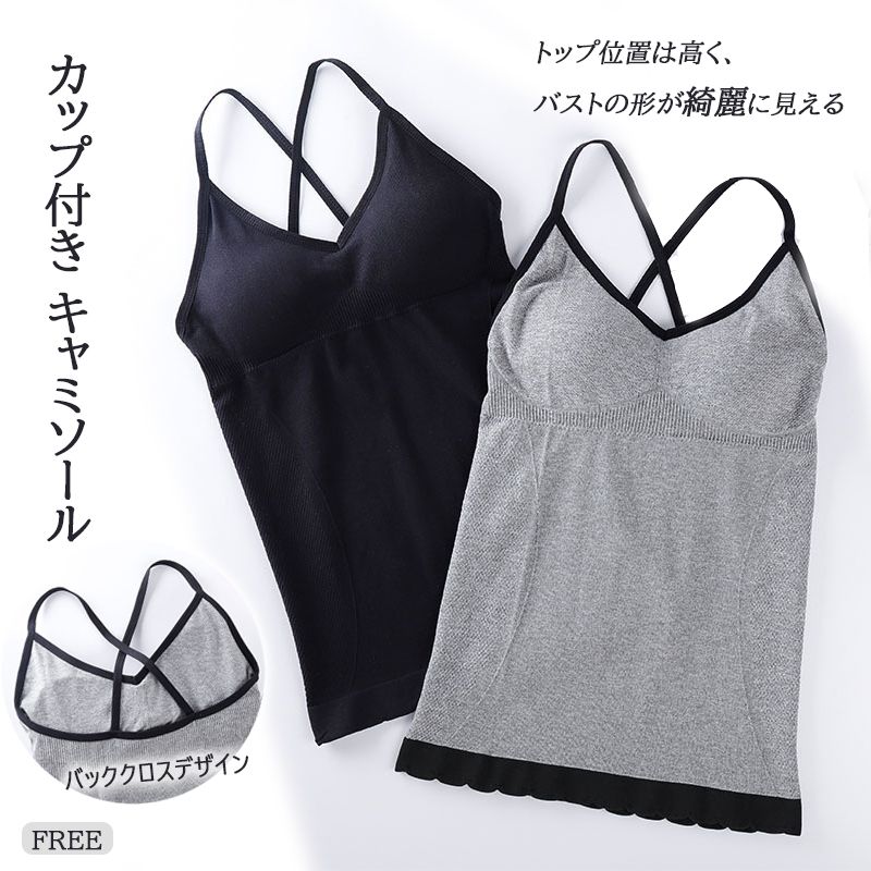 ■コメント・シンプルデザインのカップ付きキャミソールです。・程よくフィットし、ノンストレスな着心地。・ワイヤレスでもトップ位置は高く、自然とバストの形が綺麗に見えます。・クロスバックの後ろ姿が可愛い。・肩ひもがノーマルのタイプで見えても◎、ナイトウェアとしても着こなせます。■サイズフリーサイズ 40-60kg■カラー商品画像に記載■伸縮性あり■裏地なし■生地の厚さ普通■透け感なし■素材ポリエステル65%、綿30%、ポリウレタン5%