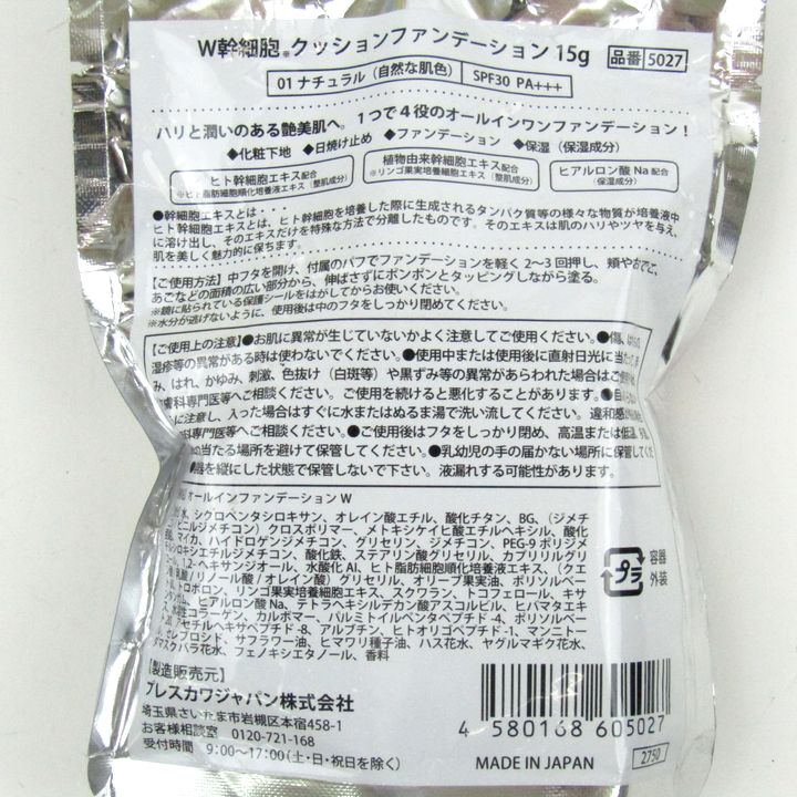 プレスカワジャパン W幹細胞クッションファンデーション 01 ナチュラル 未使用 外装ダメージ有 コスメ レディース 15gサイズ 【中古】