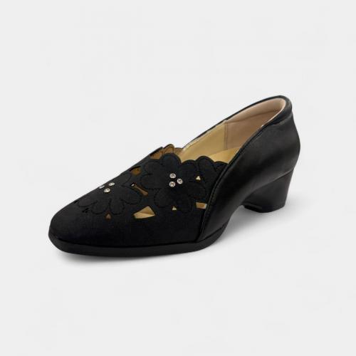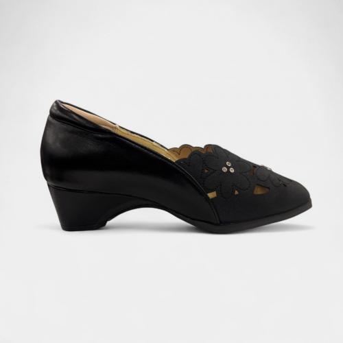 カラー:黒 商品名:⦅サンプル商品⦆4Eフラワーカットビジューパンプス