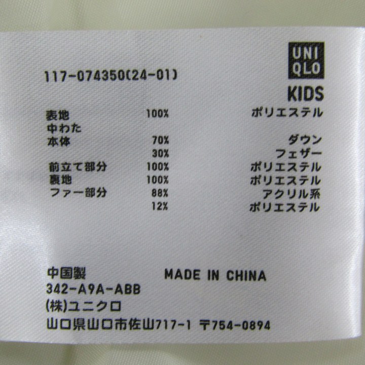ユニクロ ダウンジャケット ジャンパー 117-074350 アウター 白 キッズ 女の子用 Fサイズ ホワイト UNIQ...