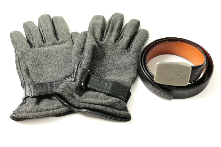 ヒューゴボス 本革レザーベルト 手袋 2点セット ブランド まとめて メンズ ブラック/グレー HUGO BOSS ...