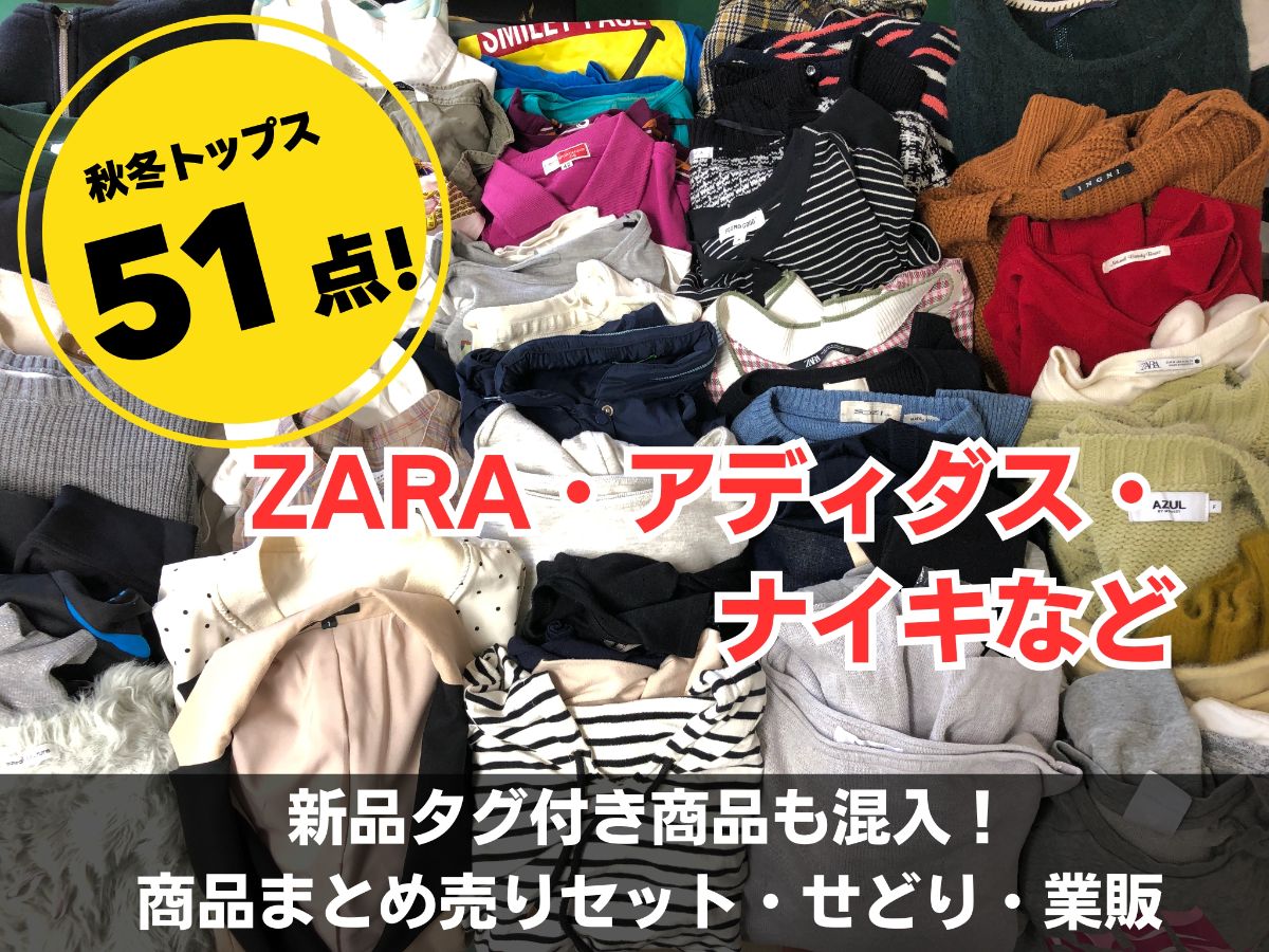 これからの季節に大活躍するレディース秋冬トップスの51点まとめ売りセットです。 ZARAやAZUL BY MOUSSYなどの人気ファッションブランドに加え、アディダス、ナイキ、ニューバランスといったスポーツブランド、さらにハナエモリなどのエレガンス系まで、非常にバリエーション豊かな内容となっています。 ニット、スウェット、カットソー、パーカーなど、即戦力となるアイテムをぎっしり詰め込みました。フリマアプリでの転売や店舗の在庫確保、リメイク素材としてもご活用いただけます。