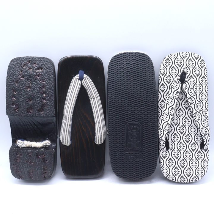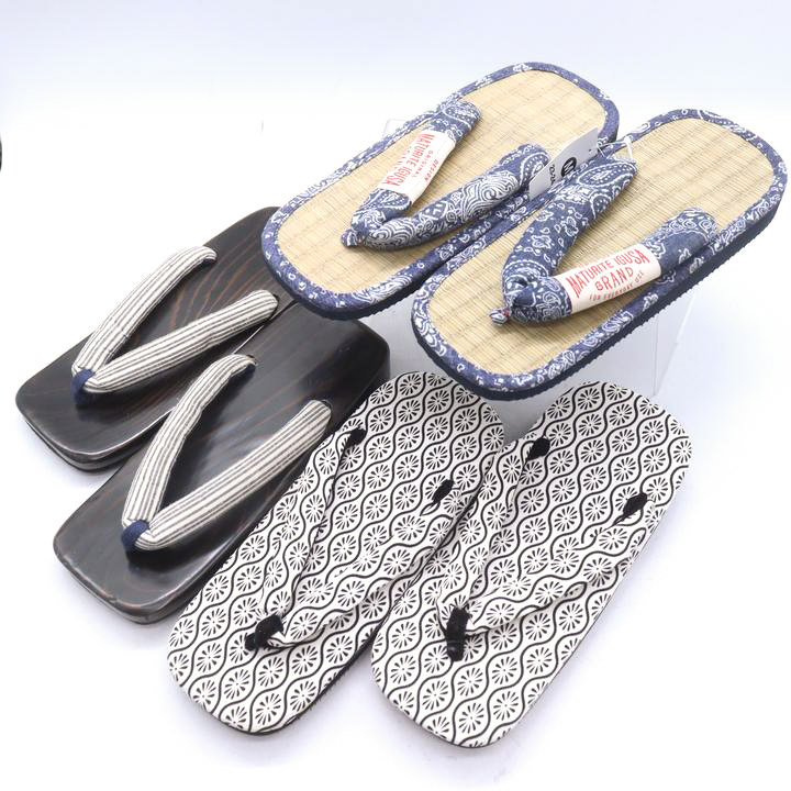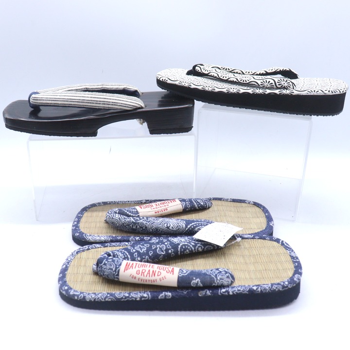 [状態追記]下駄(木目×ストライプ):キズ・へこみ有、サイズ表記なし(24cm相当)実寸:全長約25cm、幅約10cm、ソール約3.5cm/草履(たたみ×ブルー):未使用、サイズ23-24.5cm 実寸:全長約26cm、幅約10.5cm、ソール約2cm/雪駄(白×黒):未使用、サイズ:八寸六分 実寸:全長約26cm、幅約9.5cm、ソール約2.5cm