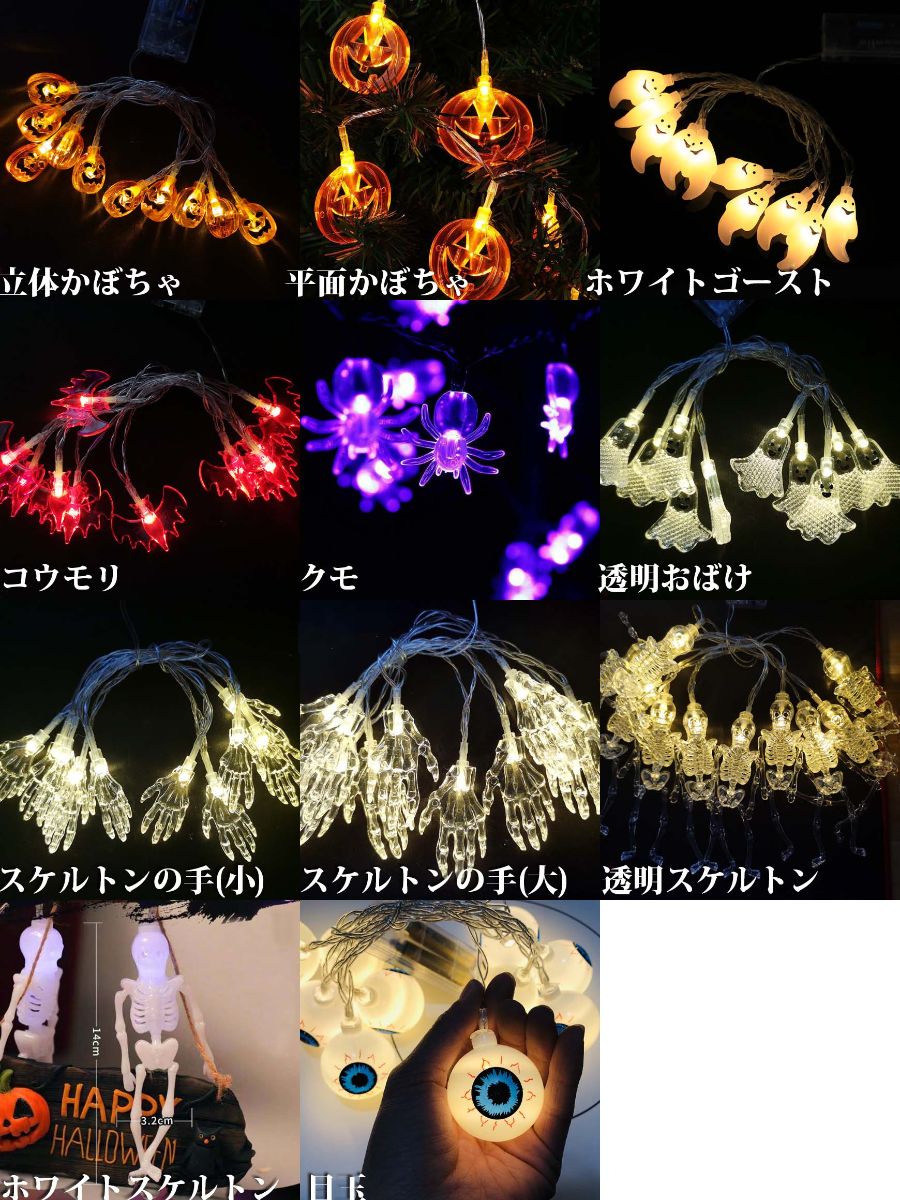 ■コメント・お部屋を可愛くユニークに演出できるハロウィンイルミネーションライト。・乾電池式なので、好きなところに設置することができます。・ハロウィンの雰囲気にぴったりなキャラクターのライトが全11種類あります。■サイズ画像に記載■サイズ●全長:1.5M-LED球数:10●全長:3M-LED球数:20●全長:6M-LED球数:40■屋内屋外屋内■本体電源電池式タイプ(別売)■カラー商品画像に記載■重量■素材PVCなど■生産国中国