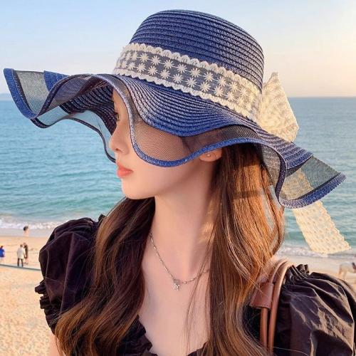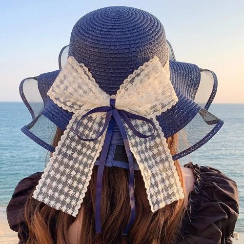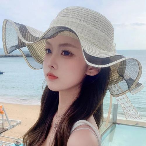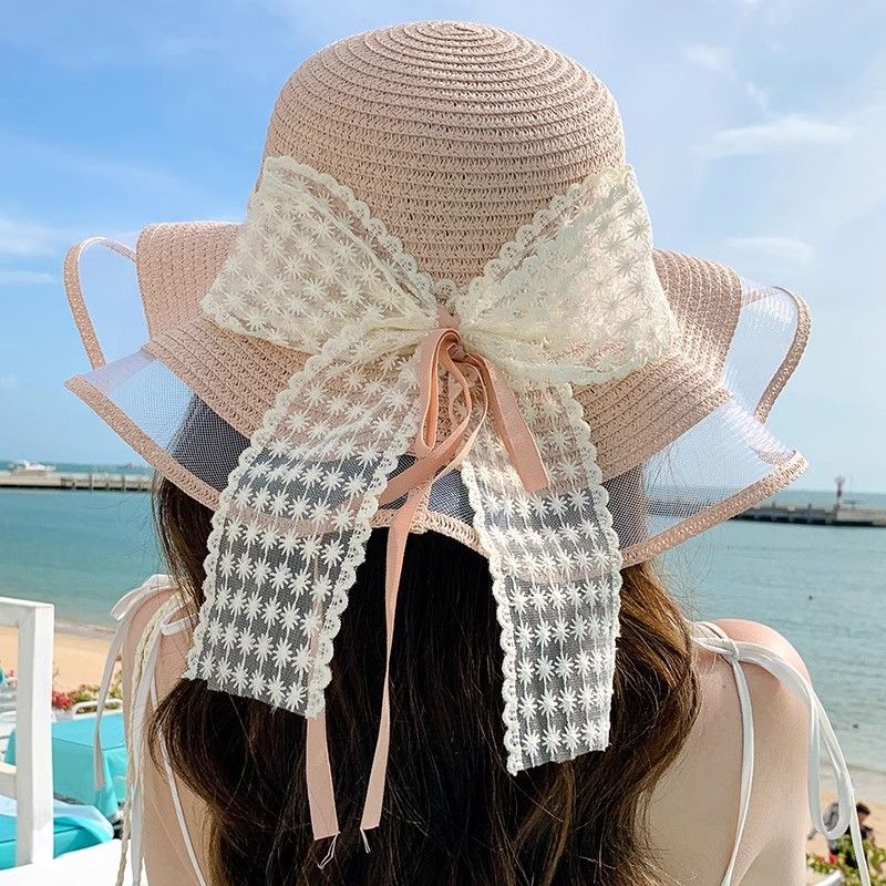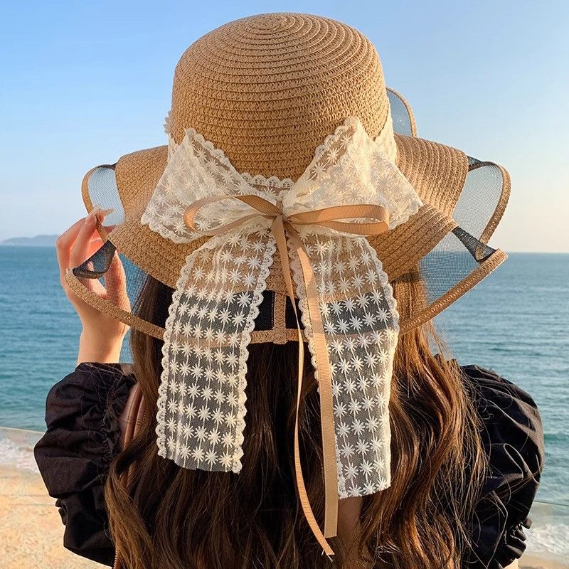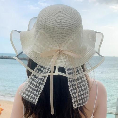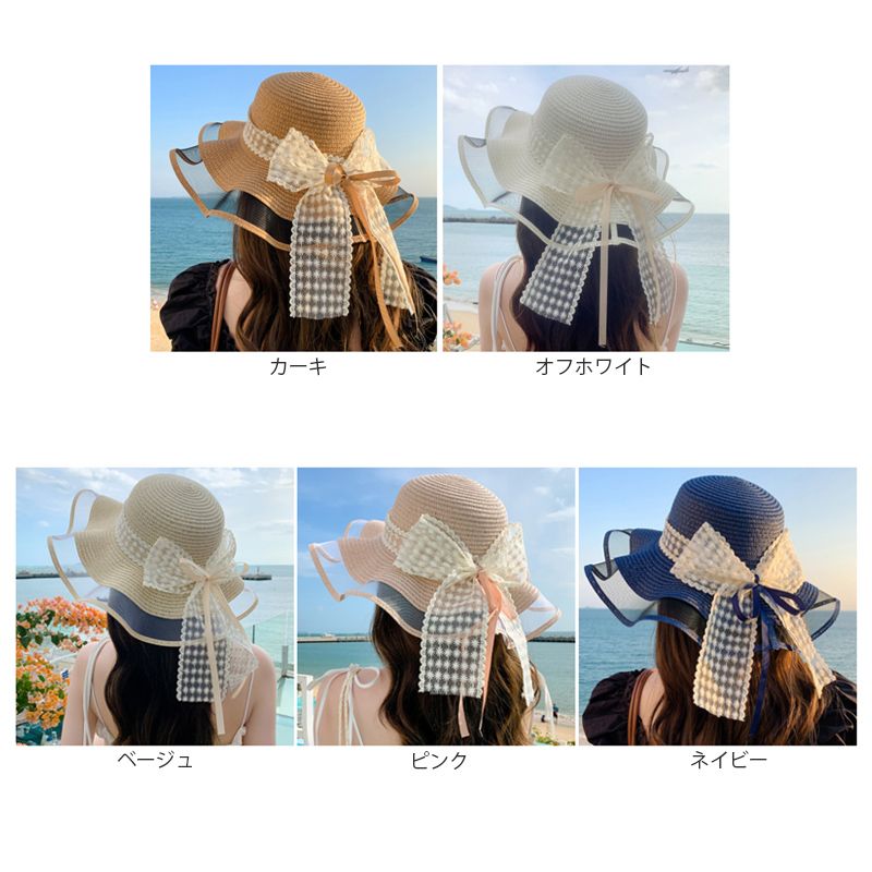 レディース 遮光 リボン 紫外線対策 つば広 エレガント 麦わら風帽子 ベージュ カーキ 女優帽 レース