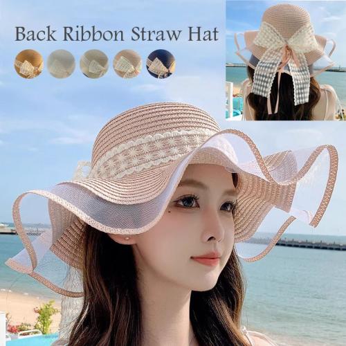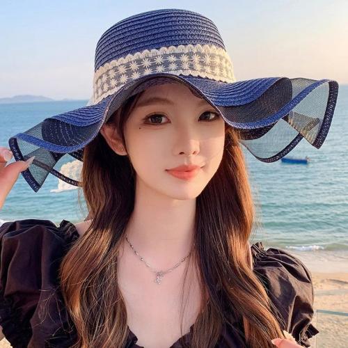 ・花柄のレースリボンが上品なつば広麦わら風帽子。